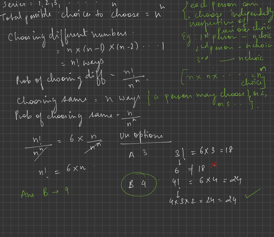 So the question starts by telling us that "Each of n people randomly selects an integer from 1 to n such that the probably that all of them choose different number is 6 times the probability that all of that chose the same number". Now the question asks us the value of n. Lets understand it with the help of an