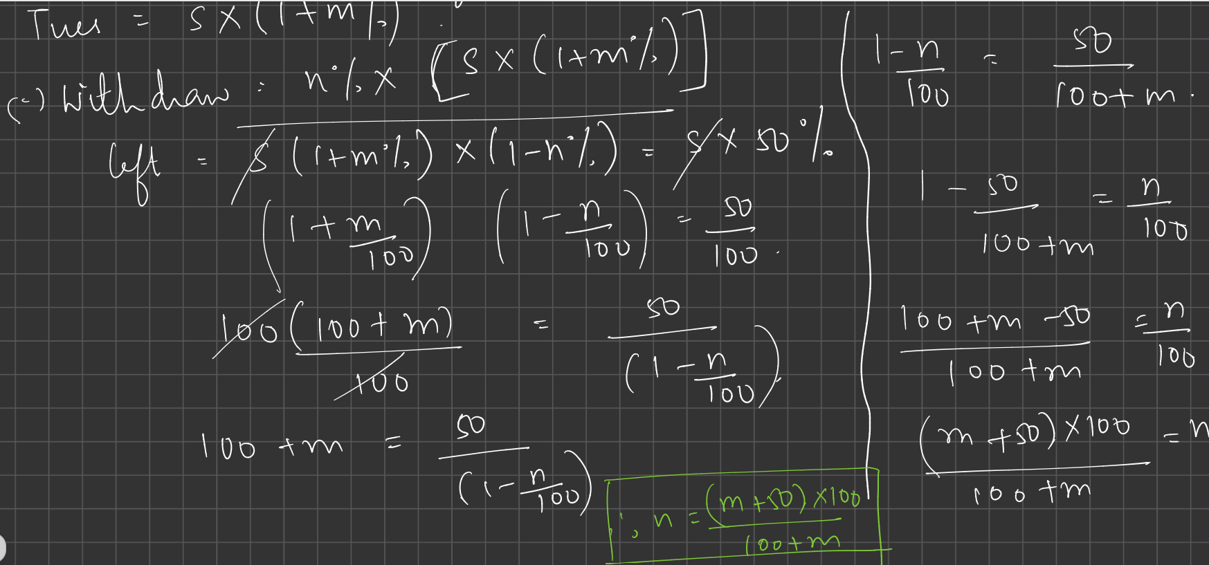 Solve:x + xm/100 – (x + xm/100)*n/100 = x/2