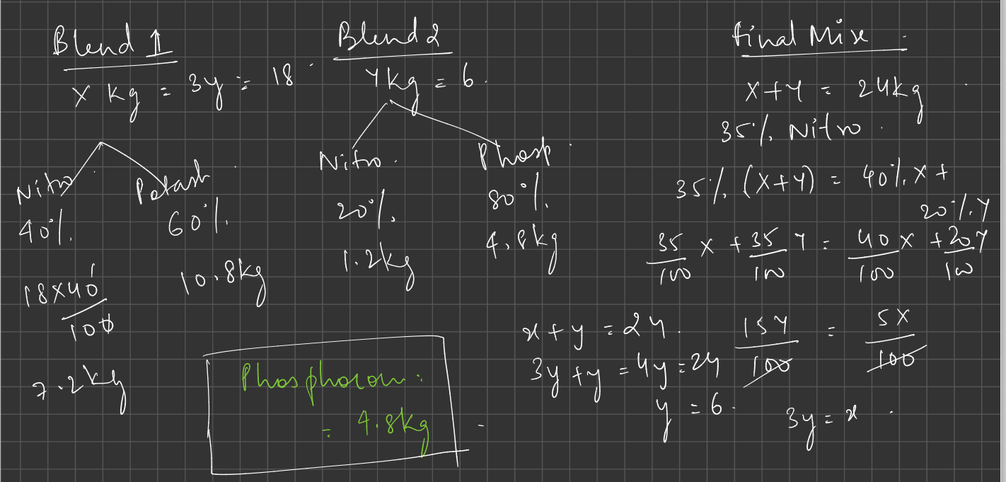 A specialty fertilizer blend contains 40 percent nitrogen and 60 percent potassium by weight. A different blend contains 20 percent nitrogen and 80 percent phosphorus. When these two blends are combined to create a final mixture, the result contains 35 percent nitrogen. If the final mixture weighs 24 kilograms, how many kilograms of phosphorus does it contain?