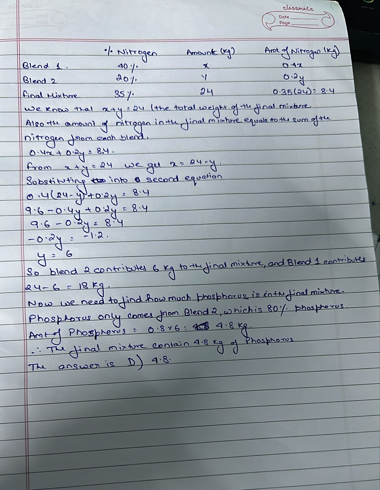 Total Nitrogen in the final mixture = 35% of 24 kg = 0.35×24 kg=8.4 kgs