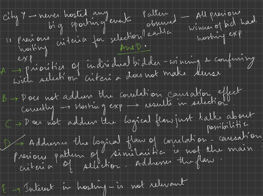 Now, this is a balanced choice and directly understanding the situation. CorrectE. It takes for granted that cities that haven’t hosted sporting events are automatically uninterested in doing so.
