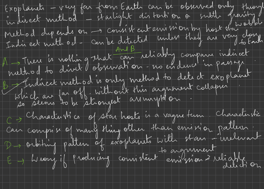 B. There are no alternative methods of detecting reliable signal data from exoplanets other than through shifts in starlight distortions or gravitational wobbles. We already know from the premises that exoplanets must be identified using indirect methods if they are too far for direct observation. This choice doesn’t add any new info or tells us about what must’ve the author assumed for drawing the conclusion. Eliminate.
