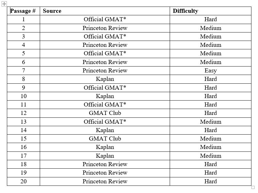 *Six passages with the GMAT Official source tag were taken from GMAT Plus Review 2002. In the book, it is claimed that the questions are official material from the GMAC, I researched and came to know that at least the majority of, if not all, are true of good quality questions which may indeed come from the official source. Conclusively the official tag is added based on my research and the probability that the questions are official. I do not claim them to be 100%, sure official.