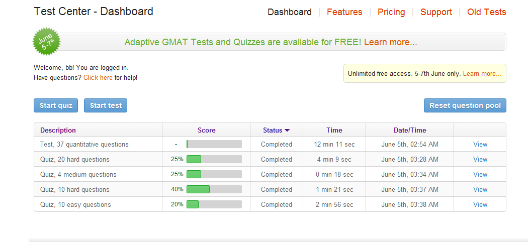 The Timer is no stranger at GMAT Club - used more than 250,000 times over the last 2 years, it is well used, but now it is drop dead gorgeous. You absolutely have no excuse not to use it. The timer times your performance (duh), but in addition to that, it records every question you attempt and saves your history. If you go back to a question you have previously attempted (had one of those deja vu's?), it will tell you when you attempted that question and how you did. There is also a very helpful question list of all your attempted questions - we call it Your Workbook. It has not been redesigned yet (Rome was not built in one day either) but it will be completely redone in early August when the entire profile area is updated. Try your skills on this one.