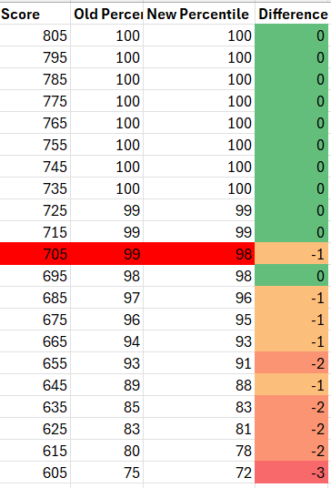 Went from a clean 720 (655 with 94th percentile) to between 710-720 with 93rd percentile. This sucks.