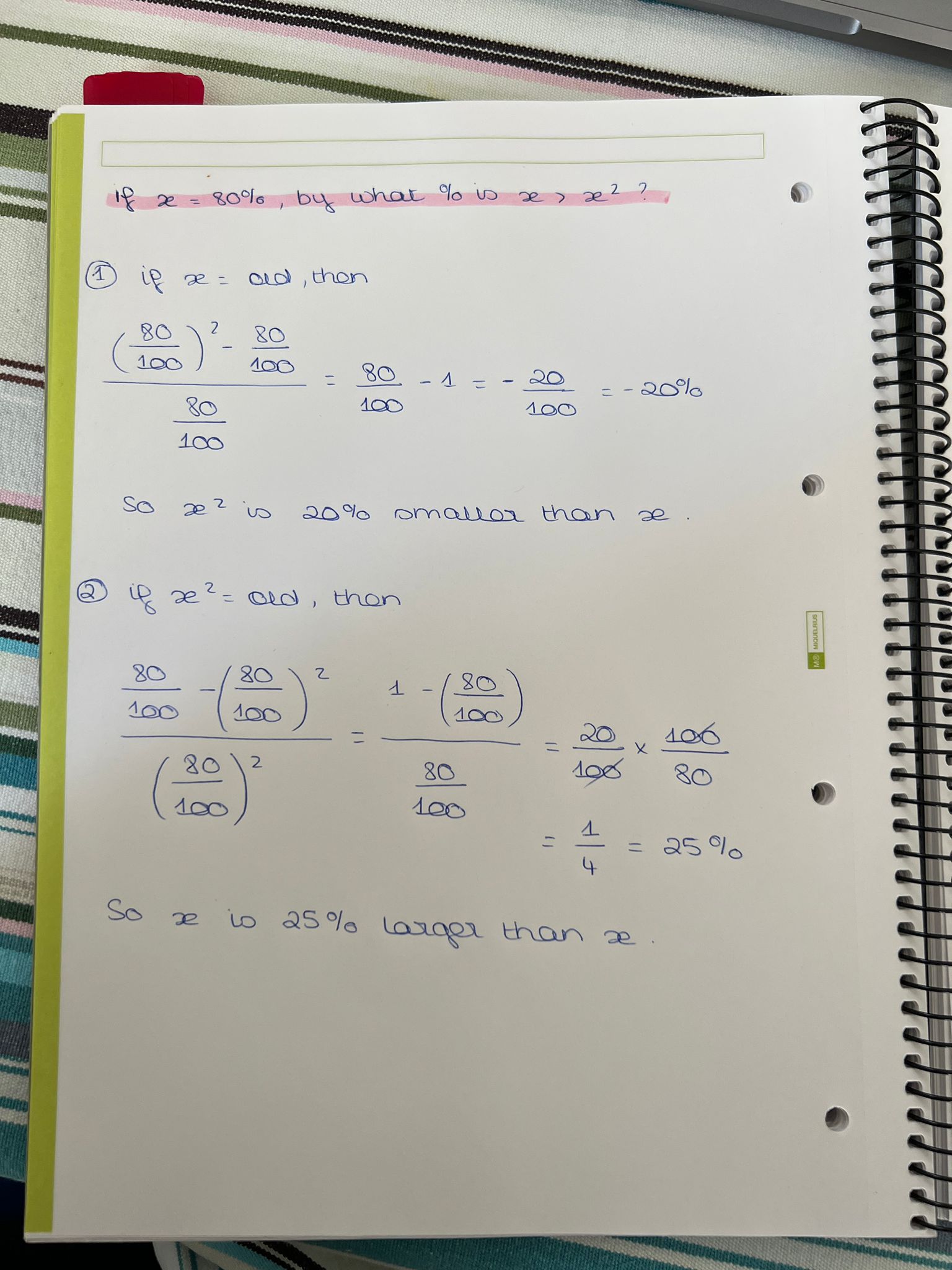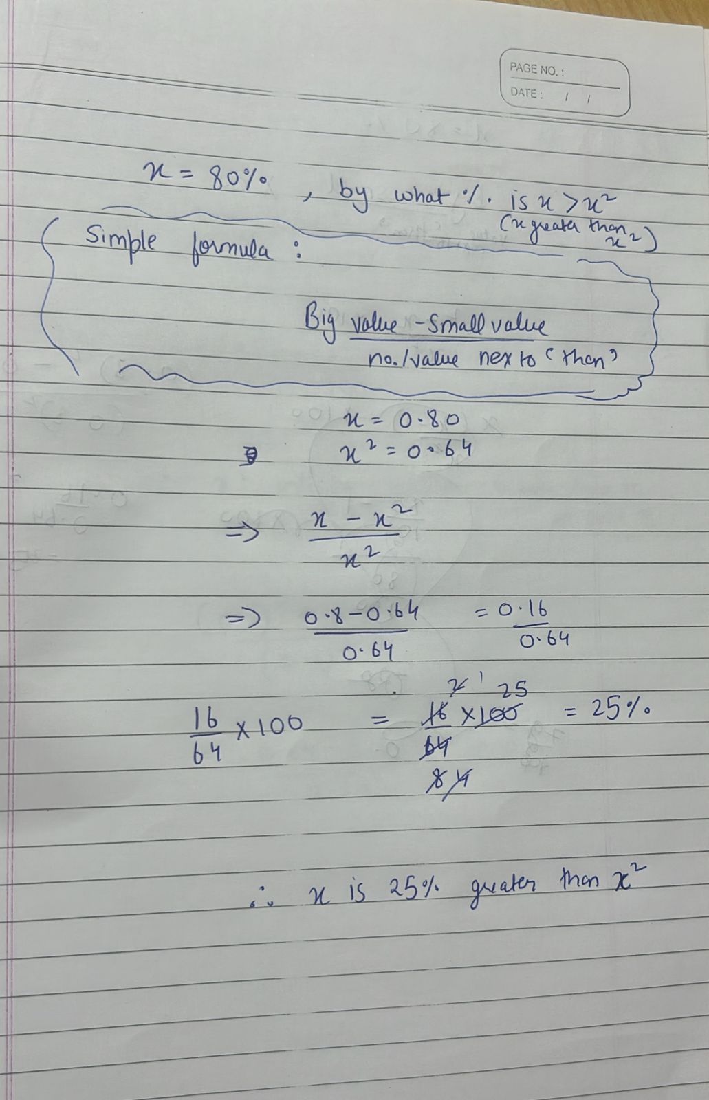 (When we are talking about percentage change from old value to new value, it would be \(\frac{\text{New Value - Old Value }}{\text{Old Value}}*100\).)In this question, we are comparing to x^2 (If x = 80%, by what percent is x larger