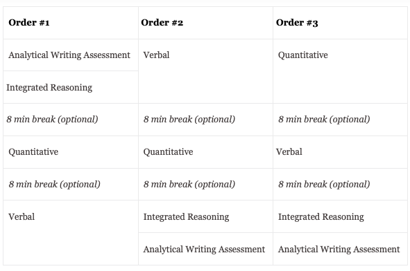 Finally, I'm going to assume that the GMAT Online's extra break is located between the 1st and 2nd sections, like the test-center GMAT, unless GMAC tells us otherwise—or between the 3rd and 4th sections if for some reason you choose the "classic" order #1 (AWA, IR, Quant, Verbal) instead of the far more popular orders #2 and #3.