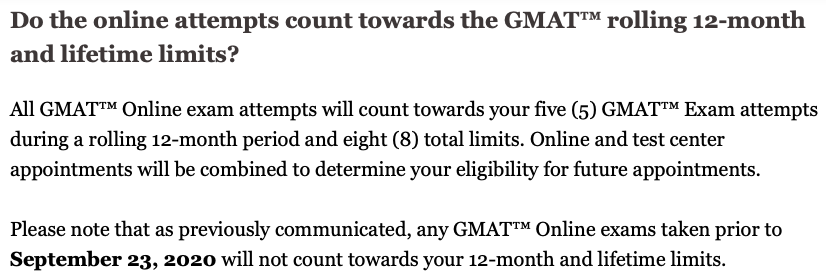 1. As you pointed out, GMAT online can only be taken two times. And if someone can only take two tests at least at this time, versus five in 12 months or 8 in a lifetime. How does that make it more profitable? They would have to wait at least until one can take GMAT online multiple times. Otherwise they will be eliminating a lot of opportunities for people to take tests and for them to make money. As you pointed out, this would be a requirement for doing online-only testing.