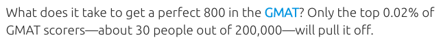 There are of course those out there who who earned their perfect 800s prior to mid-2012, and those who have chosen not to verify their 800 scores (I know one of them personally), but I doubt that there are many people in this category, and surely fewer students than GMAC claims. The official number is .02% of test-takers, or 30 out of every 200,000, but I suspect this figure to be far lower in reality.