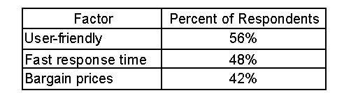 The table gives three factors to be considered when choosing an Internet service provider and the percent of the 1,200 respondents to a survey who cited that factor as important. If 30 percent of the respondents cited both "user-friendly" and "fast response time", what is the maximum possible number of respondents who cited "bargain prices", but neither "user-friendly" nor "fast response time"?