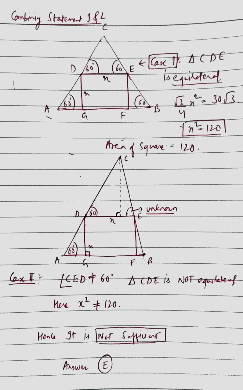 while you have combined the 2 statements you clearly deduced that angle CDE is 60* , similarly wont angle CED be 60* and triangle CDE equilateral.. hence it would sufficient to answer...