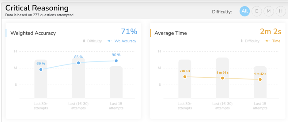 With consistent practice, this pre-thinking process became second nature. My confidence grew tremendously, and I could approach even the toughest CR questions knowing I had a systematic way to crack them. My accuracy improved to nearly 100% and my time came down to less than 2 min: