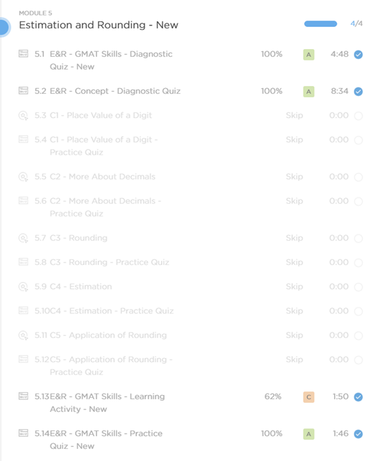 The PACE engine was a game-changer for me. It gave me diagnostic quizzes to pinpoint my weak areas and then created a customized learning path that saved me over 40 hours of study time. For stronger areas like Estimation and Rounding, it recommended skipping most content and jumping straight to GMAT-specific applications: