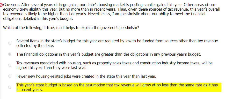 FRAME A SHADOW ANSWERTo frame a shadow answer, we need to know what the correct answer must do. In this question, the correct answer must explain why the governor is pessimistic about the state's ability to meet the financial obligations detailed in the year’s budget despite the fact that this year’s overall tax revenue is likely to be higher than last year’s.