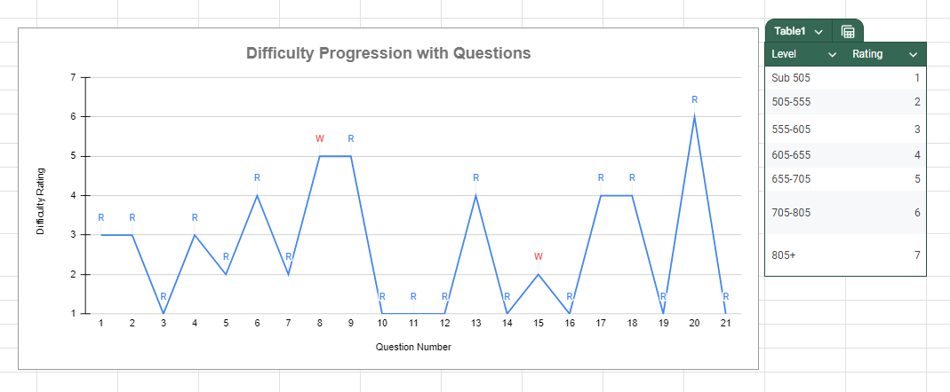 I attempted an OG mock and plotted the difficulty vs. my accuracy on a graph (attached below). Despite getting questions right in that band, I can't understand why the algorithm restricts me within the sub-505 / 505-555 band and does not present me with harder questions (like 655-705/705-805 band).