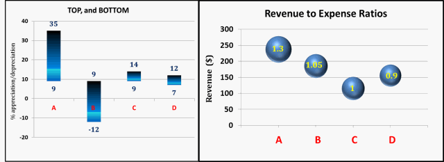 R/E ratio for A is 1.3 or 1.3/1. It means that for a revenue of $1.3, expense is $1, and profit is R-E=1.3-1=0.3. So % profit would be (P/R)*100 = (0.3/1.3)*100% =23.08%.