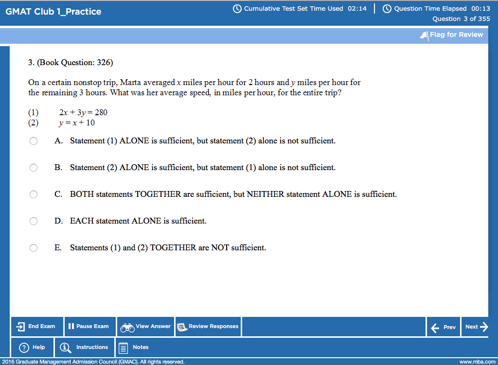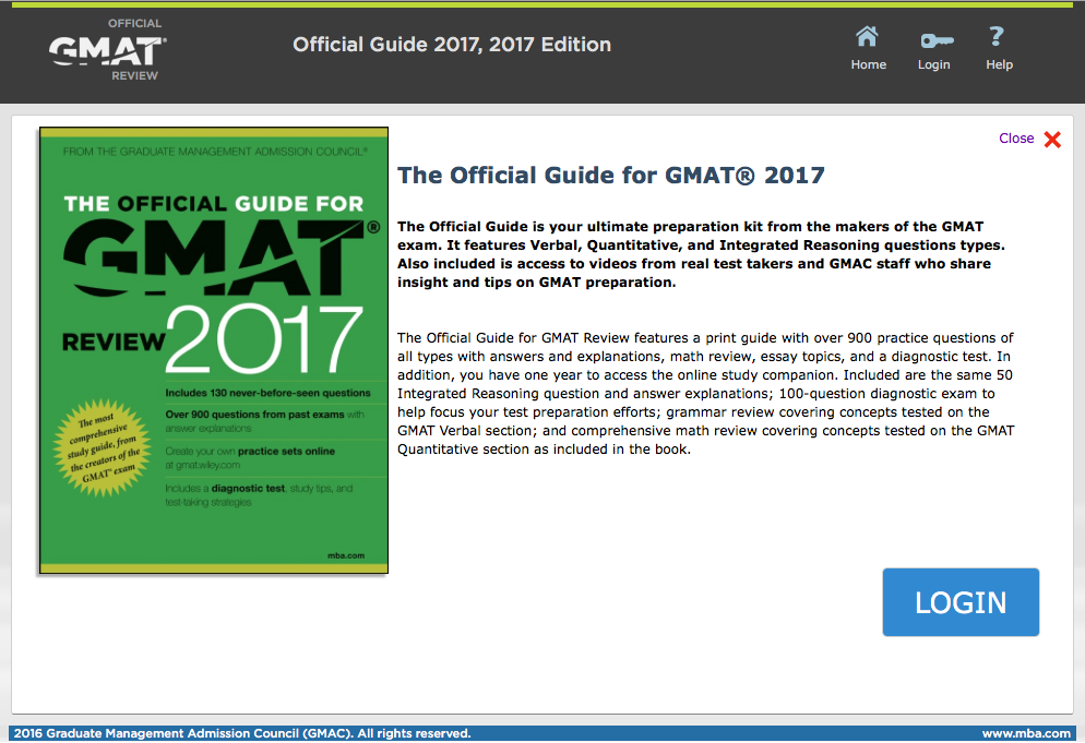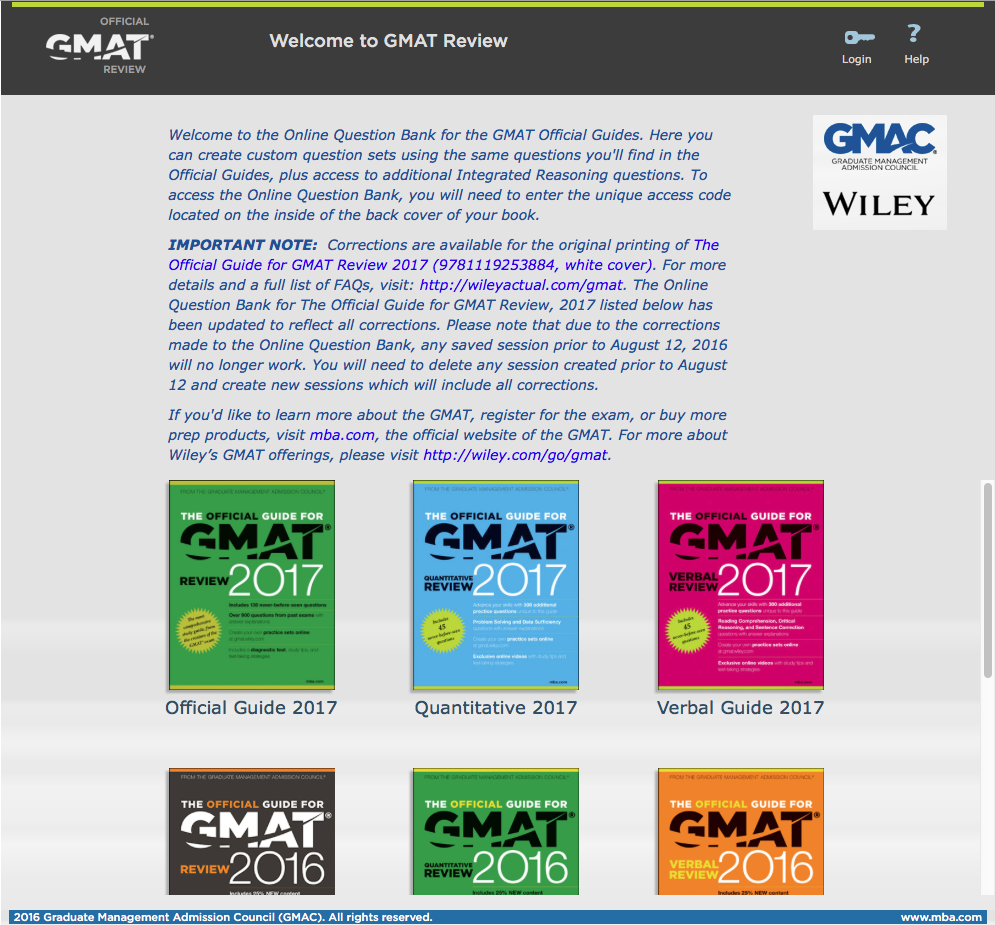 The Wiley Online Question Bank, which is included for free with your purchase of print versions of the 2017 Official Guides, is much-improved from last year’s edition, which logged you out frequently and didn’t indicate the question numbers from the paper books. This year’s edition lets you stay logged on for a long time, and question numbers are provided for reference. It even alerts you after you have spent more than 2 minutes on a question!