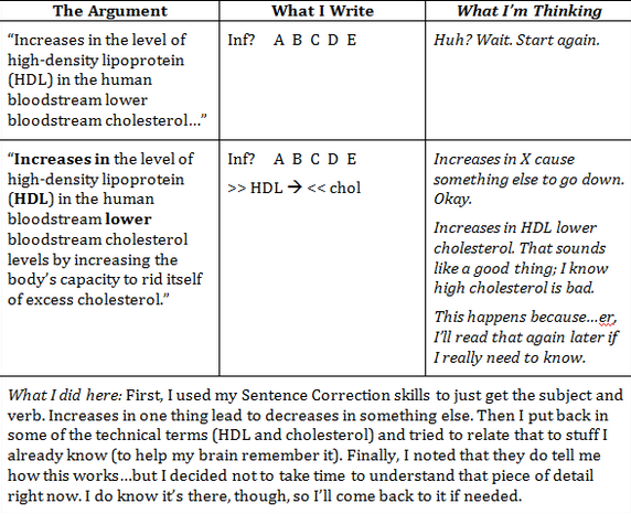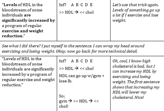 (3) Did you notice that we never had to go back to that last part of the first sentence, exactly how the body’s cholesterol levels are lowered? Sometimes, you can ignore some of the technical info forever. If possible, just try to understand why it’s there, not necessarily what it’s actually saying, so that you’ll know later whether you need to come back to it. (In this case, I knew that it was trying to explain why cholesterol levels went down. But I never needed that info!)
