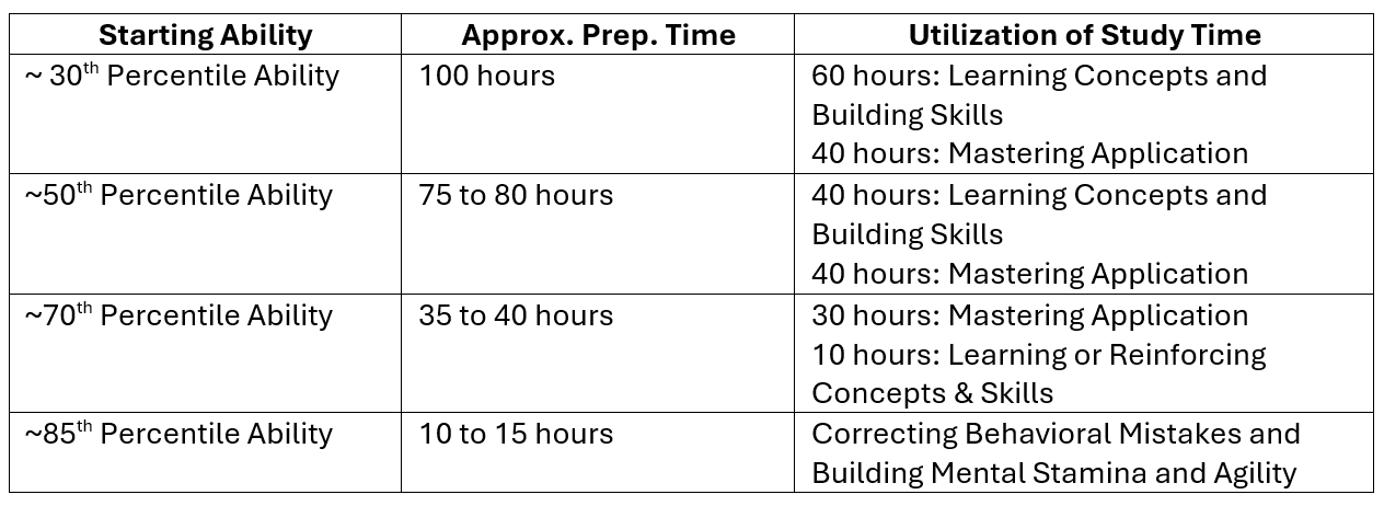 Figure 2: Study Time Allocation based on Starting AbilityFor example, if you start at the 30th percentile, you are likely to need around a hundred hours of dedicated effort, with sixty of those hours focused on building foundational skills. Conversely, if you begin at the 70th percentile, you might reach your target score with approximately 35 to 40 hours of study, allocating 70% of this time to refining your test-taking strategies and 30% to learning and reinforcing concepts.