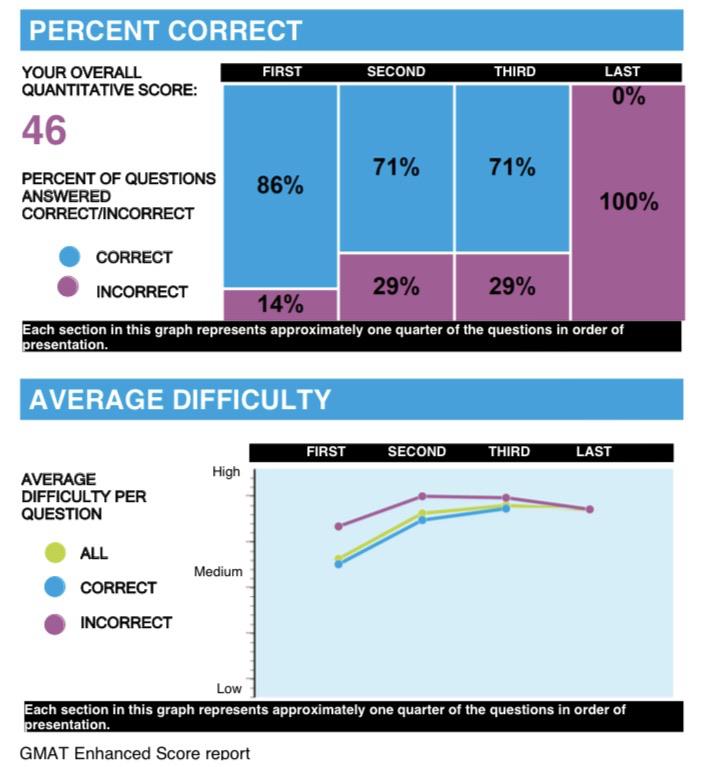Of course, there are other paths to success, but in every instance I've seen thus far, you have to answer at least 4 out of the first 7 counted questions correctly to get a great score. I've seen a Q47 scored with a (by quarters) 71% / 71% / 71% / 43% split, which suggests that you don't have to ace the 1st half so long as you keep succeeding into the 3rd quarter of the test (questions #19-27). I've also seen a Q47 scored with an 86% / 43% / 57% / 71% split, and a Q46 scored with an 86%, 71%, 71%, 0% split. Note that in all of these scenarios, students are only answering 53-64% of questions correctly, but are still earning solid Quant scores.