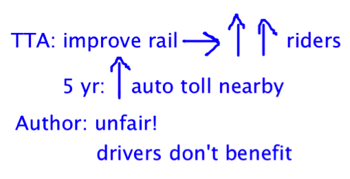 “(D) When tolls were last increased on the two bridges in question, almost 20 percent of the regular commuter traffic switched to a slightly longer alternative route that has since been improved.” Hmm. If 20% of the traffic switches, then that’s 20% of toll revenue lost. And that other route has been improved since last time? Okay, then there’s a good chance it’d happen again this time. If lots of people stop taking the toll route, the TTA is going to be losing a bunch of expected revenue. This definitely weakens the argument.