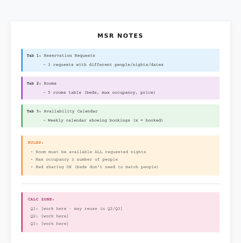 Example: Question asks if Request 1 (1 person, 3 consecutive nights) can start Monday. Your notes tell you: "Need Tab 2 for capacity (all rooms work for 1 person) + Tab 3 to check Mon-Tue-Wed availability (need one room free all 3 nights)." You navigate directly to the right information.
