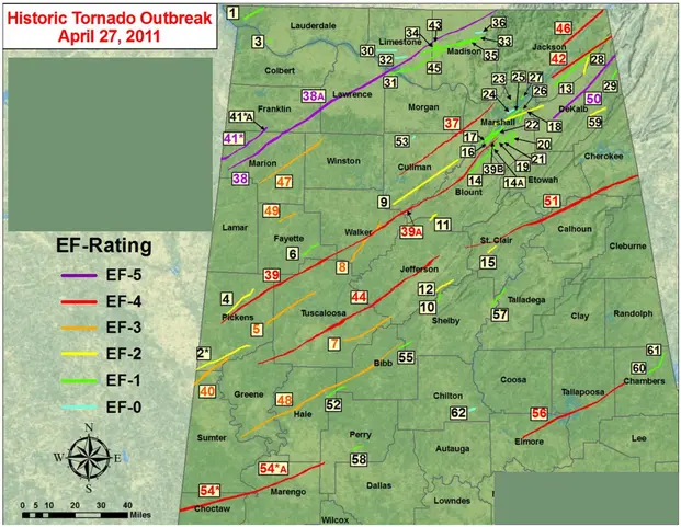 The graph shows the paths of tornados experienced in the state of Alabama on April 27, 2011 based on number and strength with EF-5 representing the strongest.