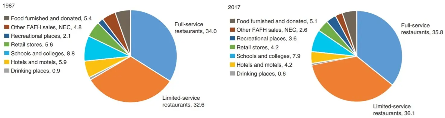 Drop-down 2: “Other FAFH, NEC” in 2017 is 2.6%. Split equally across 8 categories adds about 2.6/8 ≈ 0.33 percentage points to each. With the same increment for all, percent increase equals increment/base, so