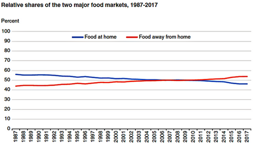 The following chart shows how the share of total food spending on food away from home (FAFH) changed relative to food at home from 1987 to 2017.