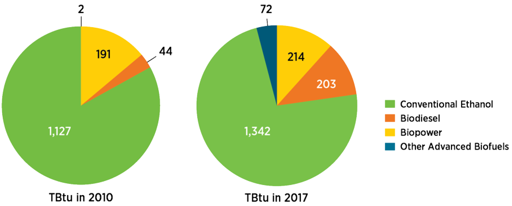 The charts display the production totals for various biofuel categories in the U.S. bioenergy market, measured in trillions of British thermal units. Total biofuel energy production was 1,364 trillion British thermal units in 2010 and increased to 1,831 trillion British thermal units in 2017.