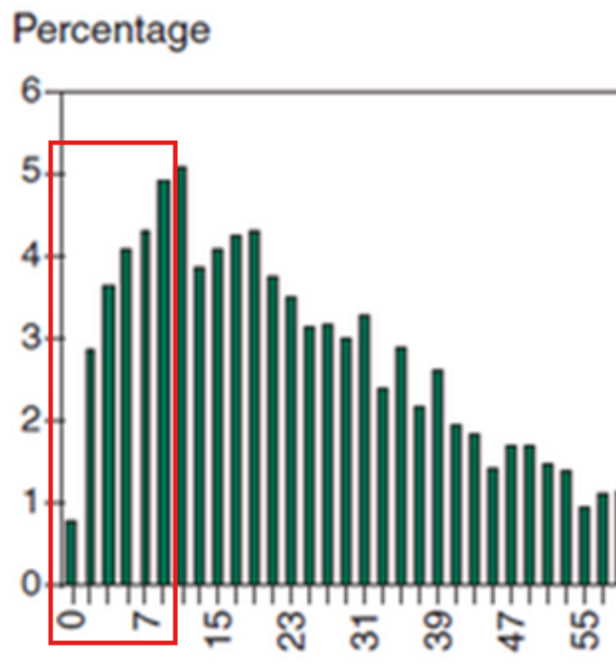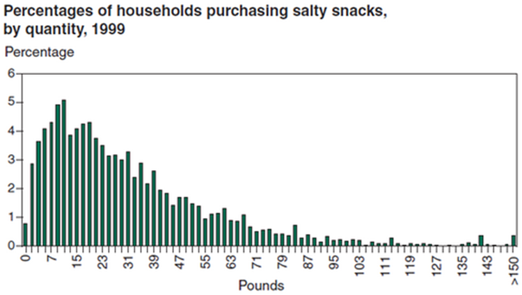 • Approximately one-fifth of all households consumed 10 pounds or fewer of salty snacks in 1999. The bars covering 0–10 pounds (from the first to the sixth bars) collectively account for close to 20% of all households, based on the percentages shown in the histogram.