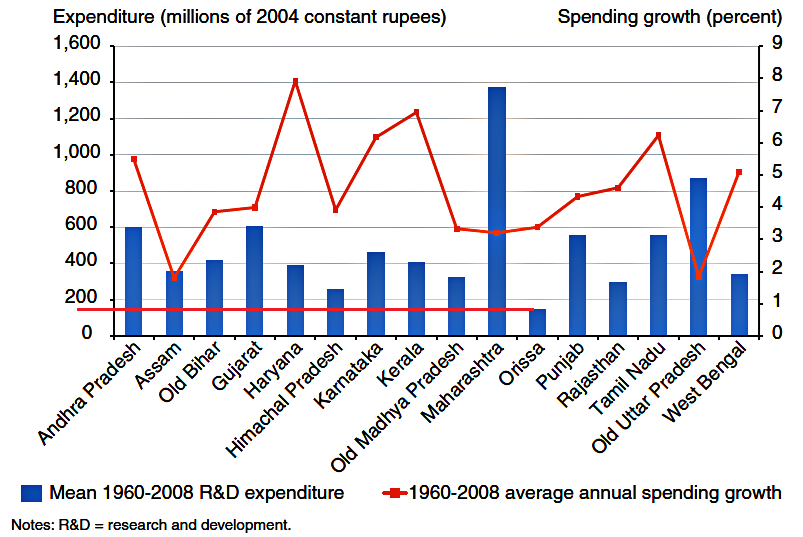 The graph above shows R&D expenditure and the average growth in spending from 1960 to 2008 across different states in India.