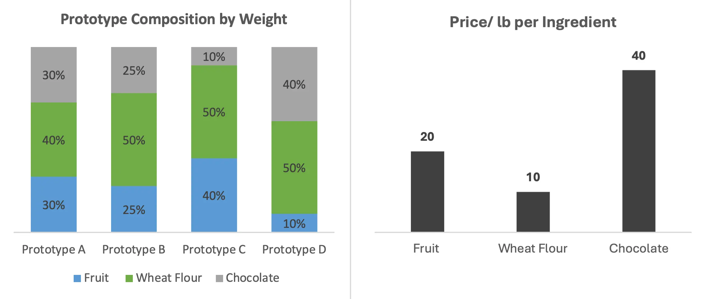 A food manufacturer has created four prototypes of a new product to be launched next year. Each prototype contains three main ingredients—fruit, wheat flour, and chocolate—in varying proportions, as shown in the first graph. The cost per pound (Price/lb) for each ingredient is shown in the second graph.