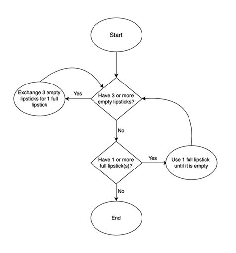 The store’s program allows Dara to trade 3 empty lipsticks for 1 new full one, as shown by the “Yes” path at the first question. With 11 empty lipsticks to begin with, Dara will be able to make this exchange three times (following the “Yes” arrow and then looping back, three times each). In so doing, Dara will trade 9 empty lipsticks for 3 full ones—and thus will have 3 full and 2 empty lipsticks.