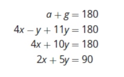 There are two paths forward from here. In order to solve directly for a, you need the values of both x and y, so you could solve for x next, then plug into the formula for a. Alternatively, use y alone to find the value of g. Since g = 11y = 11(10), the value of g is 110. And since g is a big angle, the measure of a small angle is 180 − g = 180 − 110 = 70.