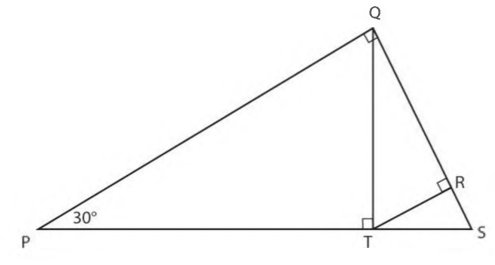 In turn, that 60° is part of a 90° angle, so adjacent ∠SQT = 30°