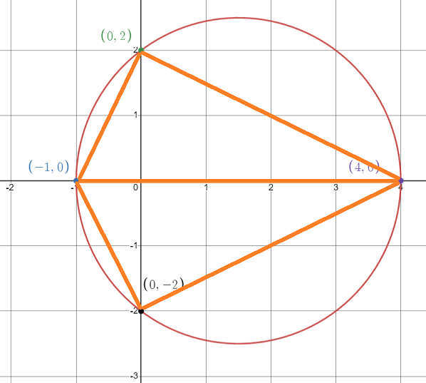 It is evident that the third vertex, which is located on the y-axis, forms a right angle. Consequently, the hypotenuse, which is on the x-axis, measures 5 units. We can consider this hypotenuse as the diameter of a circle as shown below: