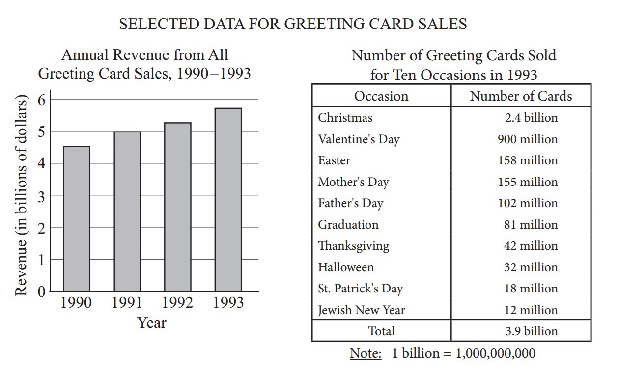 According to the table, the total number of cards sold in 1993 for the ten occasions shown was 3.9 billion. So the number of cards sold for occasions other than the ten occasions shown, in billions, was 4.6 - 3.9, or 0.7 billion. Note that 0.7 billion equals 700 million. From the table, you can see that less than 700 million cards were sold for each of six of the occasions in the answer choices: Easter, Mother’s Day, Father’s Day, Graduation, Tanksgiving, and Halloween.