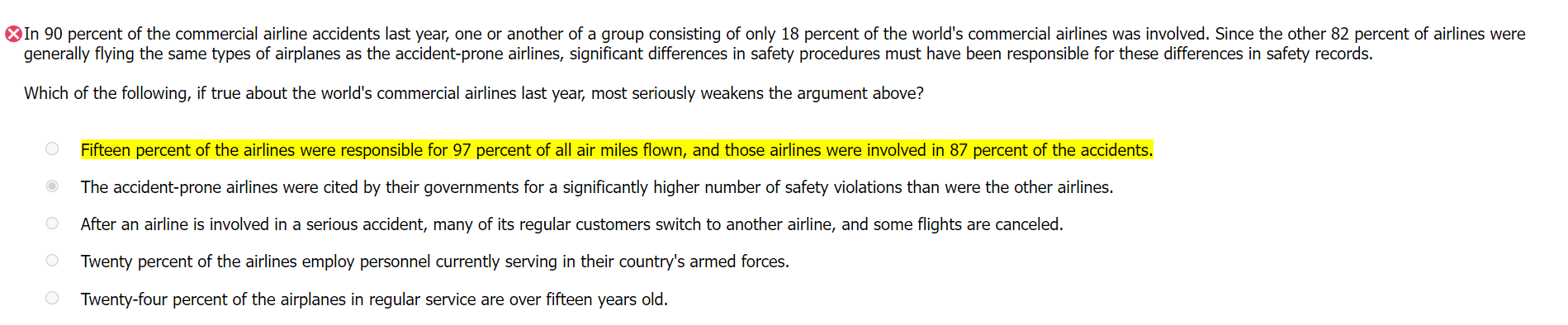 After all, if what this choice says is true, then the vast majority of the accidents involved 15 percent of airlines only because those airlines did almost all, 97 percent, of the flying. After all, we'd expect that airlines that did almost all the flying would be involved in the vast majority of the accidents regardless of whether they have safety procedures different from those of other airlines.