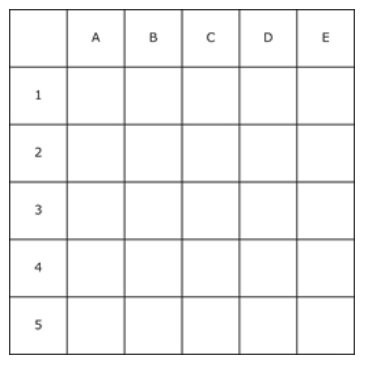 In a two-player game, the players move their pieces on a board that is marked off in squares, 5 squares wide and 5 squares deep. The five rows are labeled 1 to 5, and the five columns are labeled A to E. Each square is identified by its row number and column letter (for example, 3C). At the beginning of the game, one player's piece is placed on any of the four corner squares of the board, and the other player's piece is placed in the opposite corner. Players then take turns moving their pieces one square at a time, either horizontally, vertically, or diagonally. The game ends when a player wins by placing his or her piece on the square opposite its starting position. Players may not move their pieces so that they occupy a square adjacent to the opponent's piece, either horizontally, vertically, or diagonally. Abe and Bea are playing the game, and Abe made the first move by placing his piece on 2B.