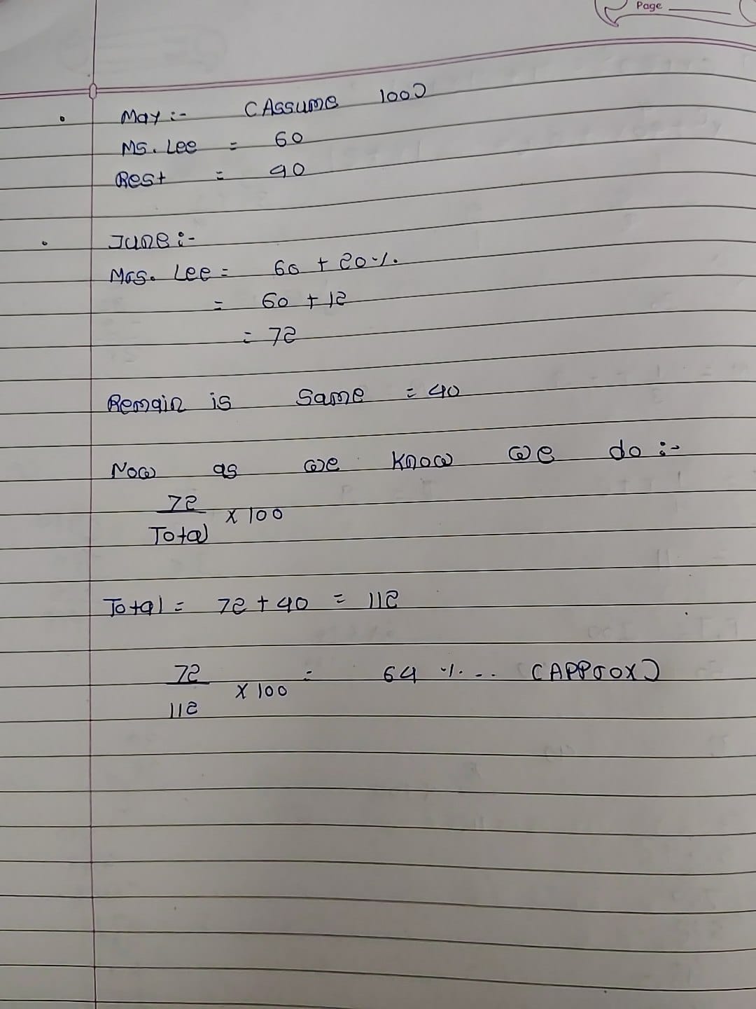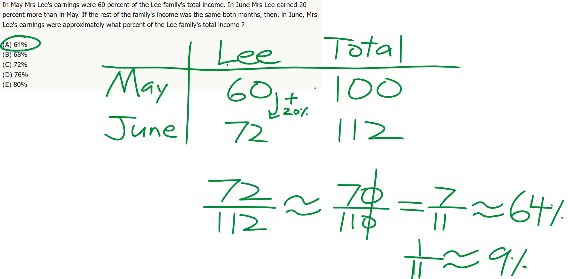 Here's how to think about it:Step 1: Understand what's happeningIn May, Mrs. Lee earned 60% of the family's total income. That means the rest of the family earned 40%. In June, Mrs. Lee got a 20% raise on her May earnings, while everyone else's income stayed exactly the same. You need to find what percent of the