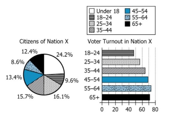 In Nation X, all citizens aged 18 or older are eligible to vote and all citizens under age 18 are not. The left graph shows the percentage of citizens of Nation X who fell within various age ranges at the time of the last election. For the same age ranges during that election, the right graph shows the voter turnout—the percentage of eligible voters who voted.