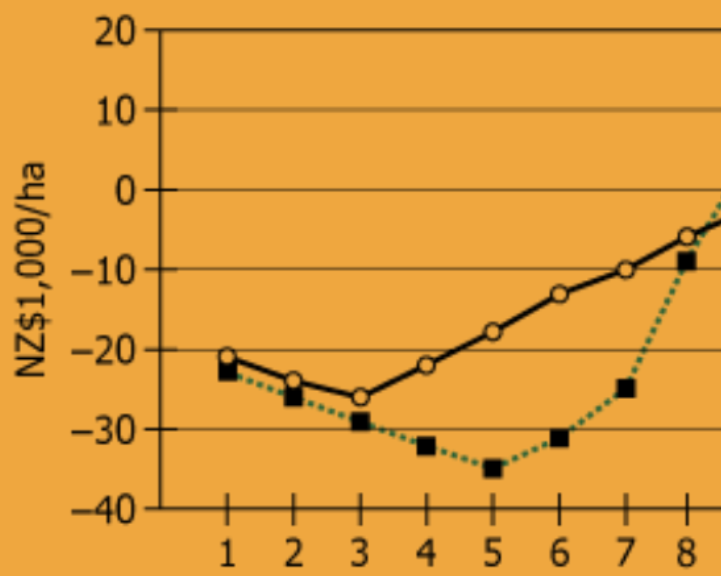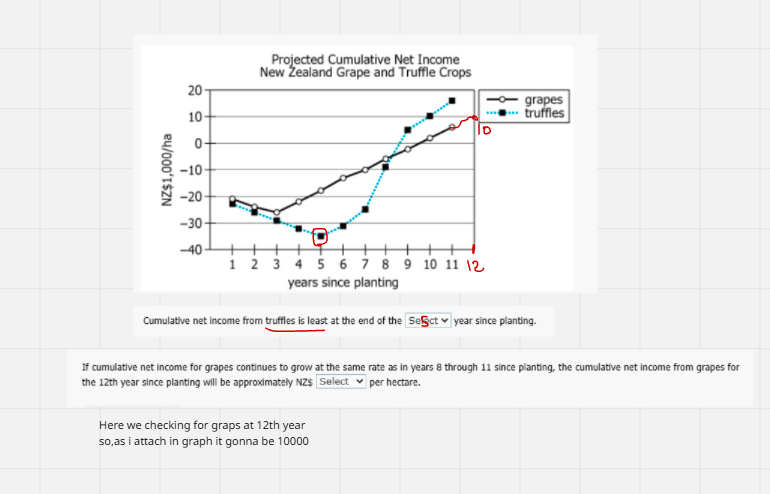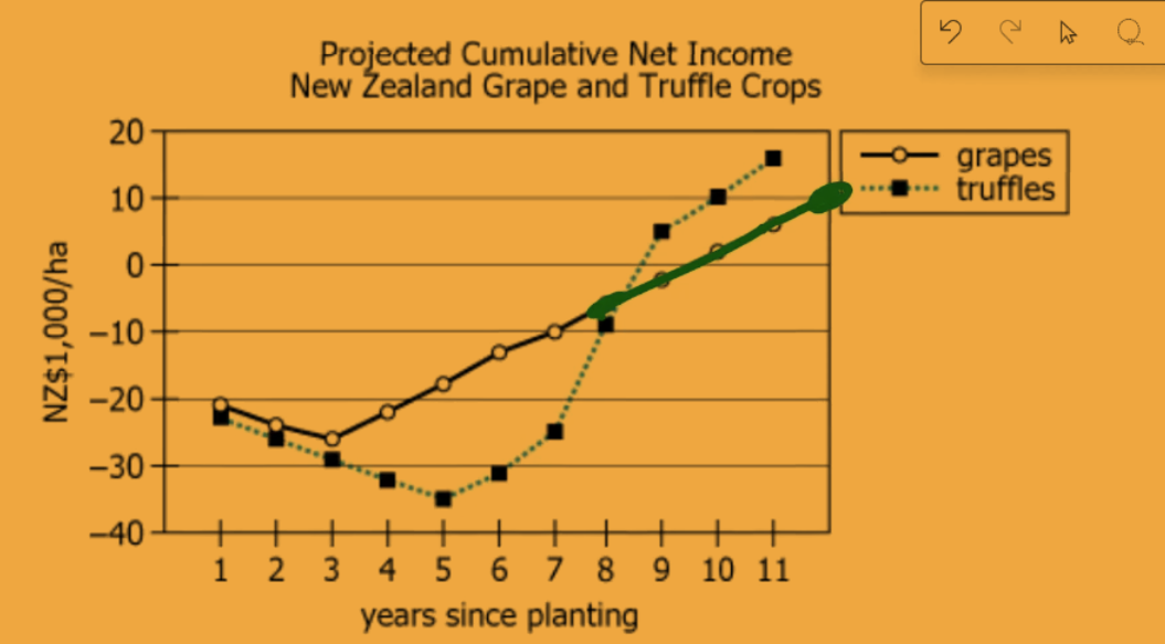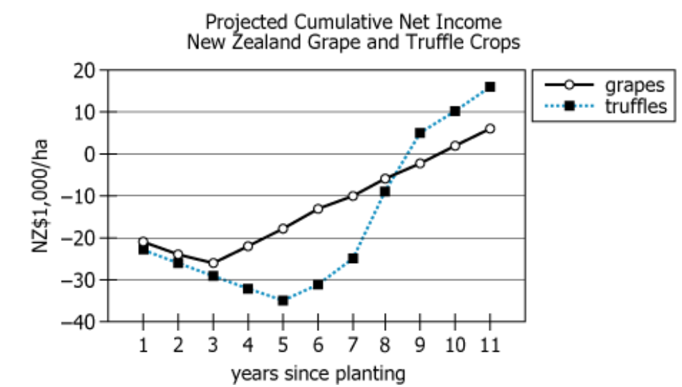 In New Zealand, the grape is a long-established crop, but the truffle—an edible fungus that grows on the roots of certain trees—became a commercial crop in the 1980s. The graph represents projected cumulative net income for grape and truffle crops through the end of the year, in thousands of New Zealand dollars per hectare (NZ$1,000/ha), for each of the first 11 years since planting. Cumulative net income is equal to total revenue from crop sales for the years since planting minus total investment costs over those same years.