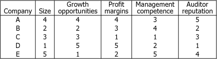 5 categories had an equal influence on the probability that a particular company is engaging in channel stuffing. Given:Companies with higher growth opportunities, higher profit margins, or less competent management are more likely to engage in channel stuffing. At the same time, our research shows that both the size of the company and the reputation of the company's auditors are positively correlated with the probability that any potential channel stuffing would be detected, and this, in turn, reduces the probability of channel stuffing occurring.Highest probability of channel stuffing occurs when - company size is small and reputation of auditors is low (Numbers 4 and 5 for these two). Competence of management is low (Number 4 or 5 for this). Also, higher growth opportunities and higher profit margins (Numbers 1 and 2 for these two) gives us higher chances of channel stuffing. For company E, growth opportunities and higher profit margins are low numbers and company size, reputation of auditors and competence of management are high numbers. Everything about E suggests that channel stuffing takes place. *Select EEdited*