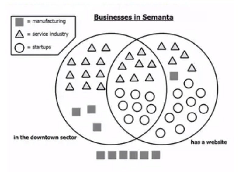 In Semanta, there are 52 major businesses: 10 in the manufacturing sector, 24 in the service industry, and 18 start-ups. All the manufacturing businesses have been in operation since before 1970. All the start-ups and a third of the service-oriented businesses were founded after the year 2000. Of businesses not in the downtown sector, approximate % are start-ups. Assume that any business founded after 2000 had a website from its start, and that any business founded with a website before that added a website after it had already been in operation. These latter companies constitute % of companies with a website.