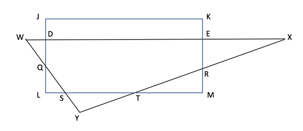 In the diagram above, triangle WXY intersects rectangle JKLM at points D, E, Q, R, S, and T. If line WX is parallel to line JK, what is the measure of angle WYX?