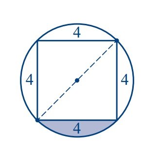 Note that the diagonal divides the square into two isosceles right triangles with legs of length 4. By the Pythagorean theorem applied to one of the right triangles, the length of the diagonal is equal \(\sqrt{4^2+4^2}\) to or \(4 \sqrt{2}\). Thus the radius of the circle is r=\(\frac{4\sqrt{2}}{2}\) and the area of the circle is \(πr^2 = π(2\sqrt{2})^2 = 8π.\) Terefore the area of the shaded region is \(\frac{8π -16}{4}\) or \(2π - 4\). The correct answer is Choice B.