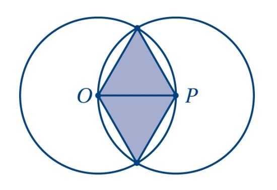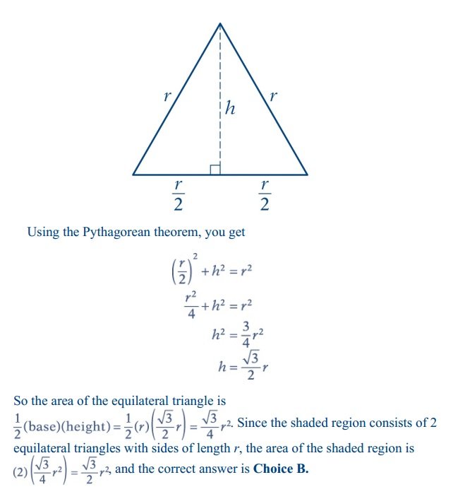 The two circles have the same radius, r. Therefore, in each of the triangles, all three sides have length r, and each of the triangles is equilateral. If you remember from geometry that the height of an equilateral triangle with sides of length r is \(\frac{\sqrt{3}}{2r}\), you could use that fact in solving the problem. However, if you do not remember what the height is, you can use the following figure to help you find the height.