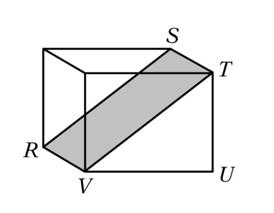 To find the area of the shaded rectangular region, you need to multiply the length of the rectangular region by its width. In this question you are given the lengths of three edges: TU=3, UV=4, and VR=2. Note that VR is the length of the shaded rectangle. To find the width of the shaded rectangle, you need to find either RC or VT. Note that VT lies on the front face of the rectangular solid. It is the hypotenuse of right triangle VUT. You know that and UV=4, so TU=3 by the Pythagorean theorem you can conclude that