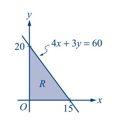 OEConsider the three lines that bound triangular region R. Te line x = 0 is the y-axis, and the line y = 0 is the x-axis. Te line 4x + 3y = 60 intersects the x-axis at (15, 0) and intersects the y-axis at (0, 20). Te fgure below shows region R.